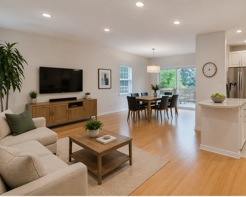 Open-concept living room, dining area, and kitchen with hardwood floors, light-colored walls, and modern furnishings. The living room has a beige sofa, a wooden coffee table, and a TV console. The dining area has a table and chairs by a sliding glass door leading to a deck. The kitchen has white cabinets, stainless steel appliances, and an island with a bowl of green apples. The bottom images show three bedrooms: one with a green bedspread, one with a white comforter, and a pink-themed room with stuffed animals.